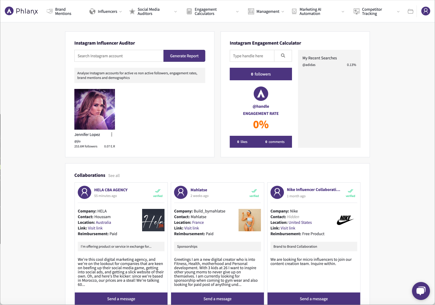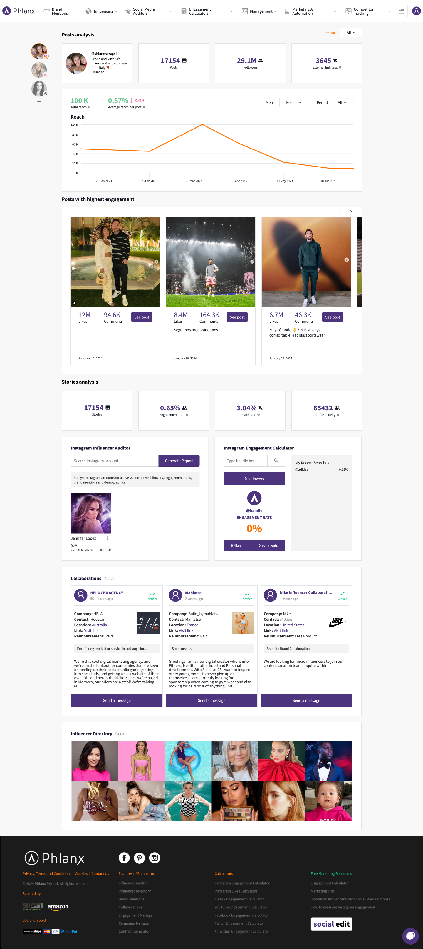 Phlanx is a marketing platform designed to connect influencers and brands, manage contracts, and measure engagement across social media channels.