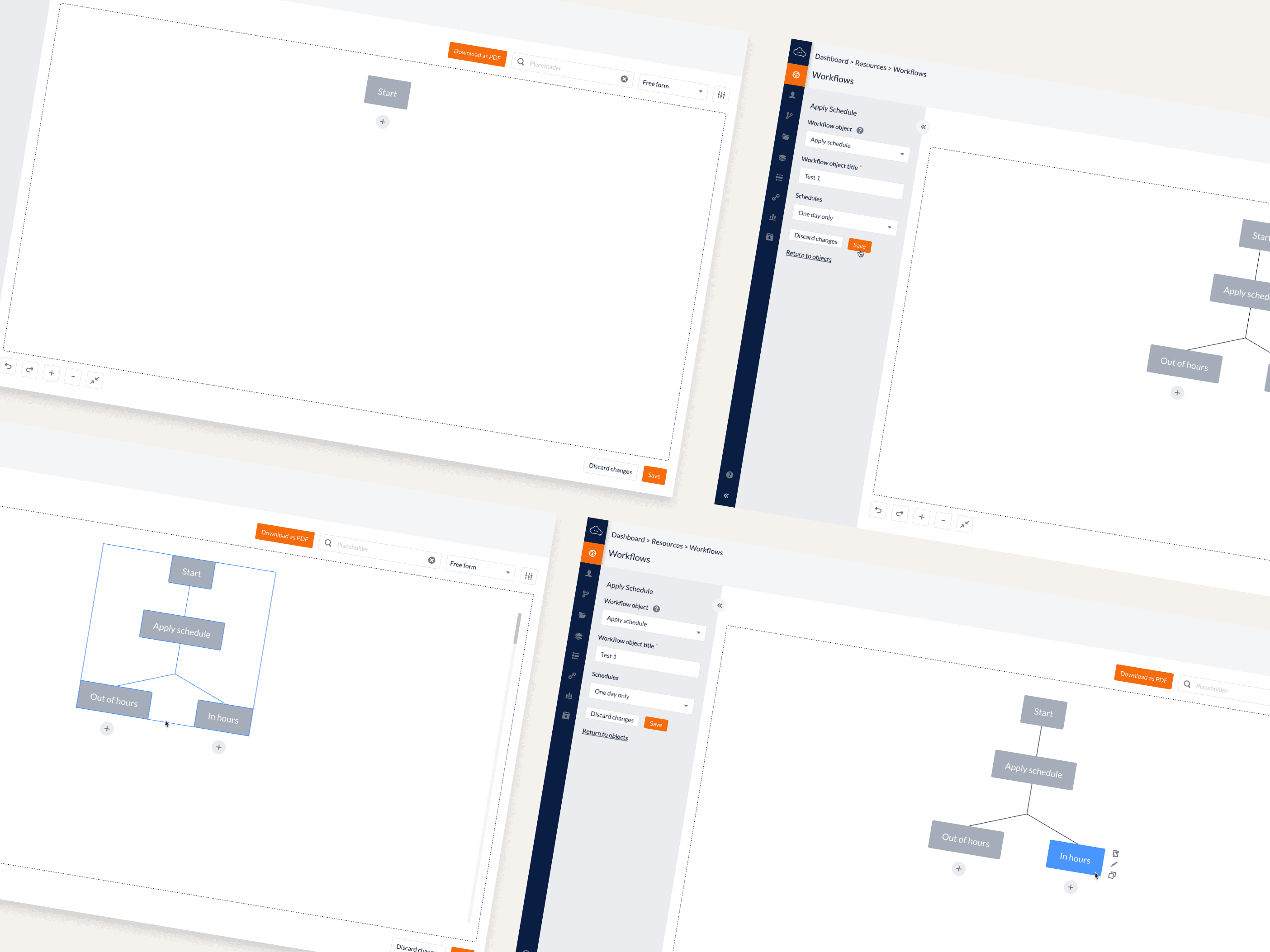 Cross-workflow links (e.g. “Go to workflow X”) visualized as connections.